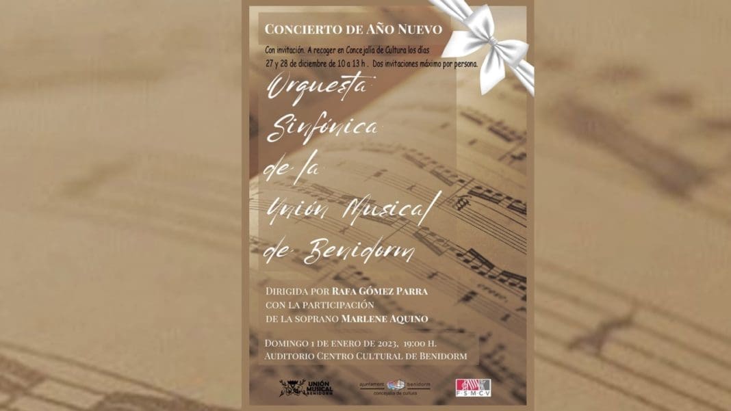 Benidorm dará la bienvenida a 2023 con un concierto de Año Nuevo de la Orquesta Sinfónica de la Unión Musical, que estará acompañada en el escenario del centro cultural por la soprano Marlene Aquino, según ha informado hoy el edil de Cultura, Jaime Jesús Pérez. Este recital del 1 de enero dará comienzo a las 19.00 horas y para asistir será necesario contar con invitación.