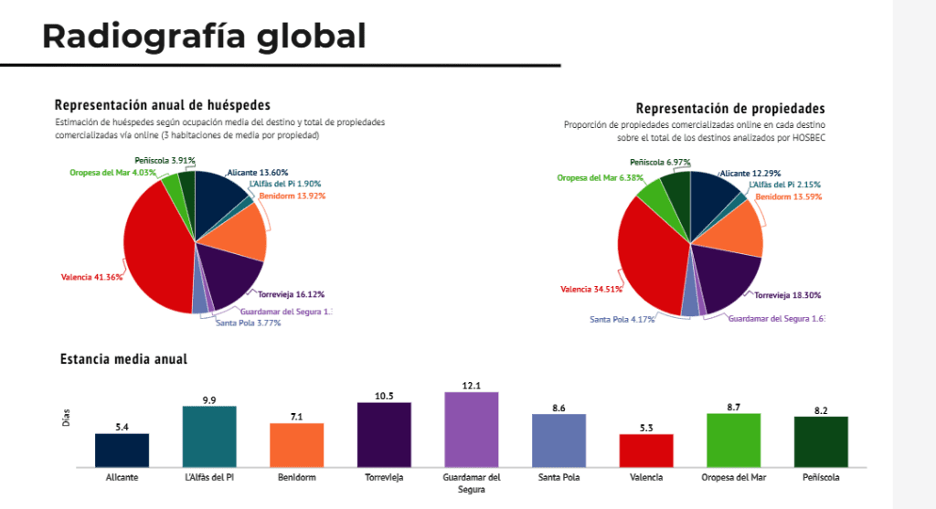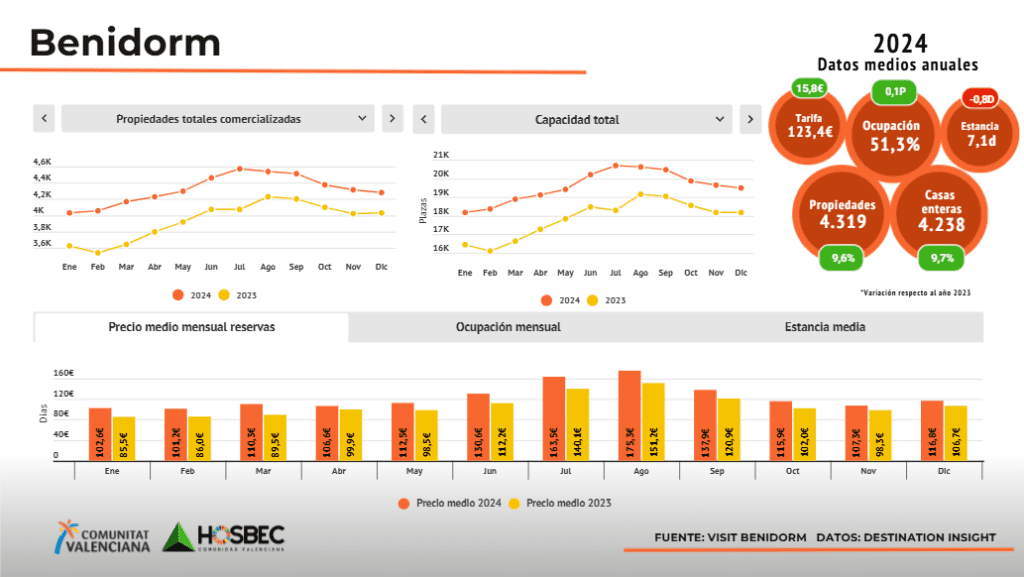 La tendencia de la estancia media es claramente descendiente en todos los destinos frente a 2023, salvo L’Alfàs del Pi que crece pero muy ligeramente (+0,1 día).