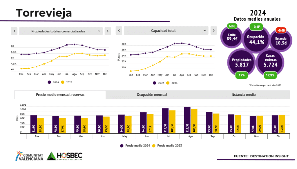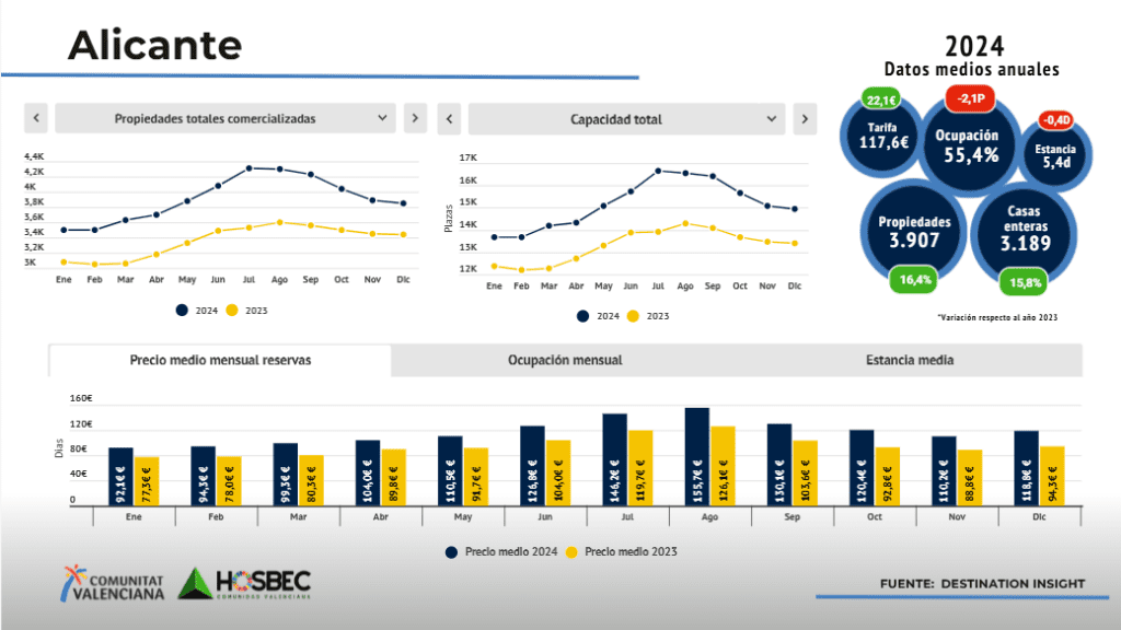 La ocupación se ha visto resentida: sólo Guardamar crece en ocupación media mientras que Benidorm y Torrevieja se mantienen en valores similares a los de 2023. El resto de destinos pierden ocupación: destacable es la caída de 4 puntos de Valencia en ocupación media anual, motivada sobre todo por la DANA y sus efectos: en los meses de noviembre y diciembre se dejó casi 10 puntos de ocupación este sector de la vivienda turística.