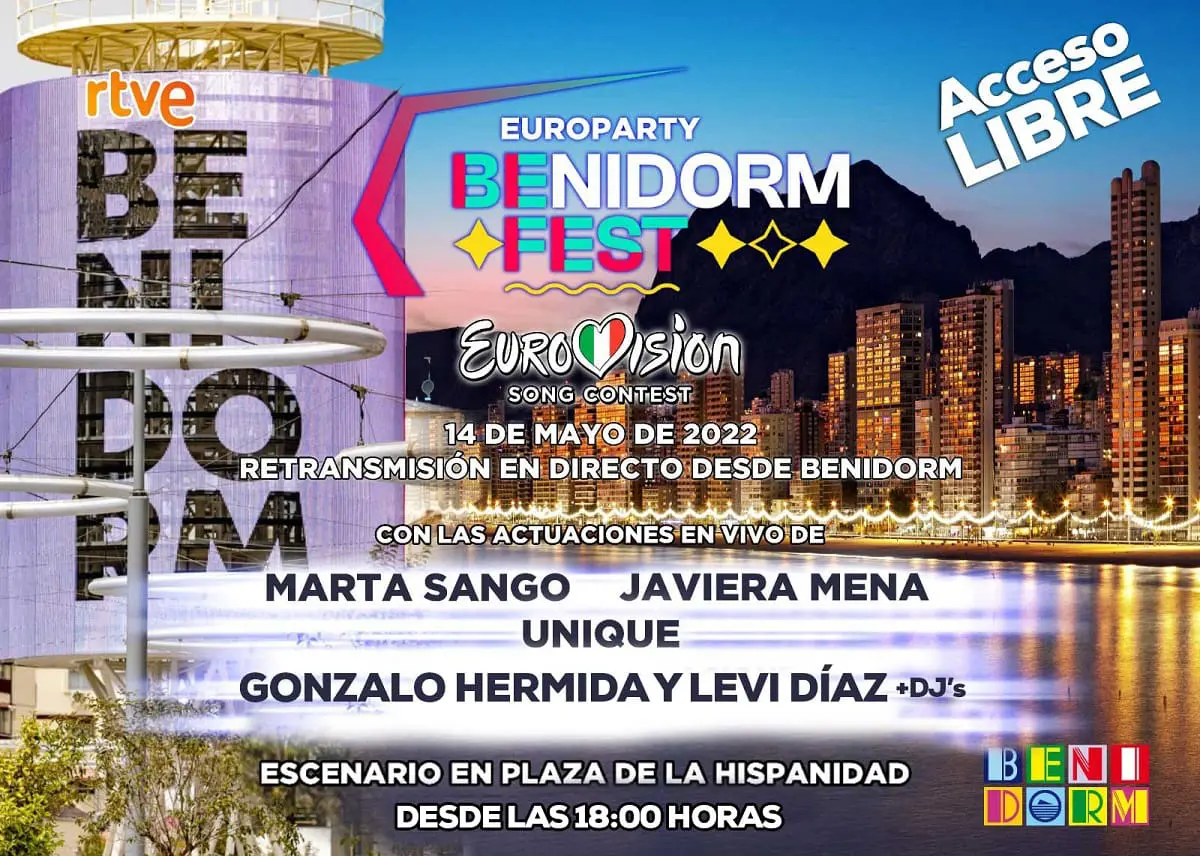La Europarty Benidorm Fest Eurovisión 2022, está organizada por el Ayuntamiento y dará comienzo con un show de DJ’s a las 18 horas. Será un espectáculo de libre acceso dando cabida al público que quiera acercarse a compartir la noche eurovisiva en la Plaza de la Hispanidad.