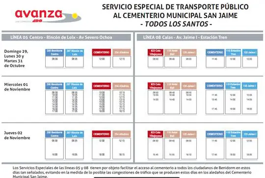 A lo largo de este lunes y mañana martes, 31 de octubre, habrá salidas especiales de las líneas 5 y 8 hacia el cementerio. Así, en la línea 5, que une el Centro con el Rincón de Loix y Severo Ochoa, se fija una salida a las 09.30 horas desde la parada Centro Benidorm; a las 09.35 horas desde el Rincón de Loix; a las 12.00 horas desde el cementerio; y 15 minutos después desde la parada de Albatros –Atmella del Mar, 5-.