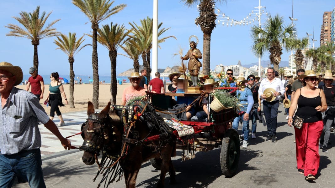 Tras dos años sin poder celebrarse debido a la pandemia, Benidorm vive este fin de semana las fiestas en honor a San Isidro, una de las festividades más arraigada y antigua de la ciudad. Una fecha en la que la tradición de la huerta se deja sentir en algunos de los enclaves del Benidorm más turístico con la tradicional romería, en la que una decena de carros han acompañado al patrón de los agricultores en su recorrido por el Paseo de Levante, avenidas Ametlla del Mar y Severo Ochoa y Camí Vell de l’Albir hasta alcanzar la Ermita de Sanç.
