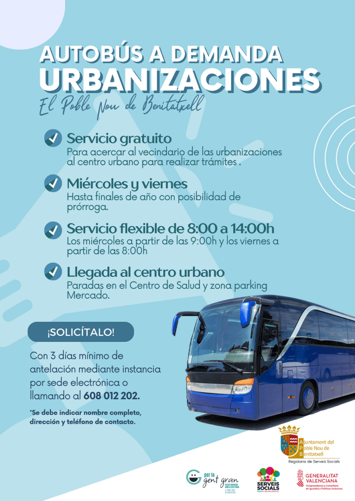 Llegar al centro urbano de El Poble Nou de Benitatxell desde las urbanizaciones y diseminados será más fácil a partir de este mes de julio. El Ayuntamiento, a través de la concejalía de Servicios Sociales y Mayor, tiene previsto habilitar un autobús a demanda gratuito que recogerá al vecindario de las urbanizaciones en la puerta de sus casas (o en un punto cercano acordado) cuando lo soliciten.