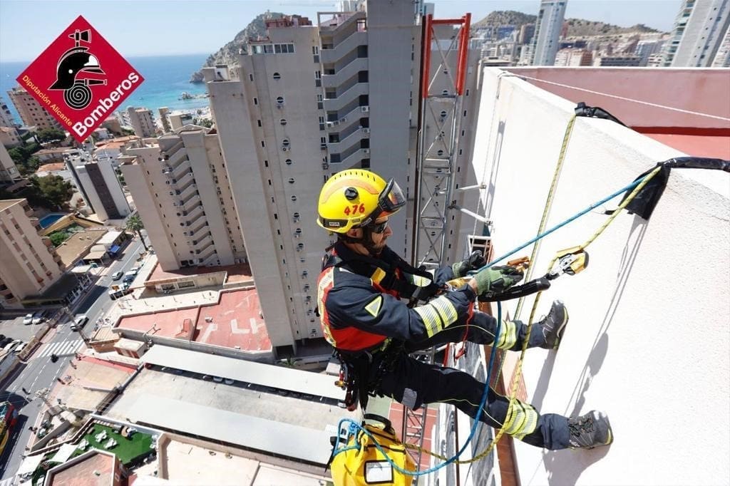 La actividad, en la que han participado una decena de efectivos del Parque de Benidorm, ha estado orientada principalmente a comprobar el estado y el buen funcionamiento de los equipos conocidos como ‘columnas secas’, una conducción que lleva el agua a todas las plantas de un inmueble y que es clave para actuar de forma rápida y segura.