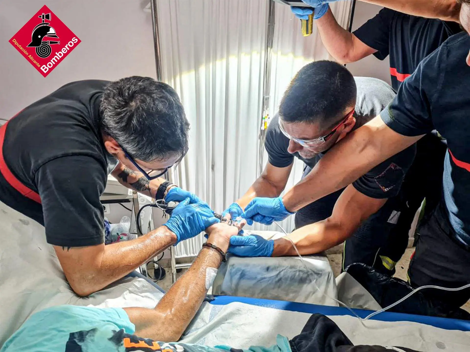 Efectivos de bomberos y medios sanitarios han retirado a una persona, mediante una herramienta dremel, un anillo que aprisionaba su dedo anular, según ha indicado el Consorcio Provincial de Bomberos de Alicante a través de sus redes sociales.