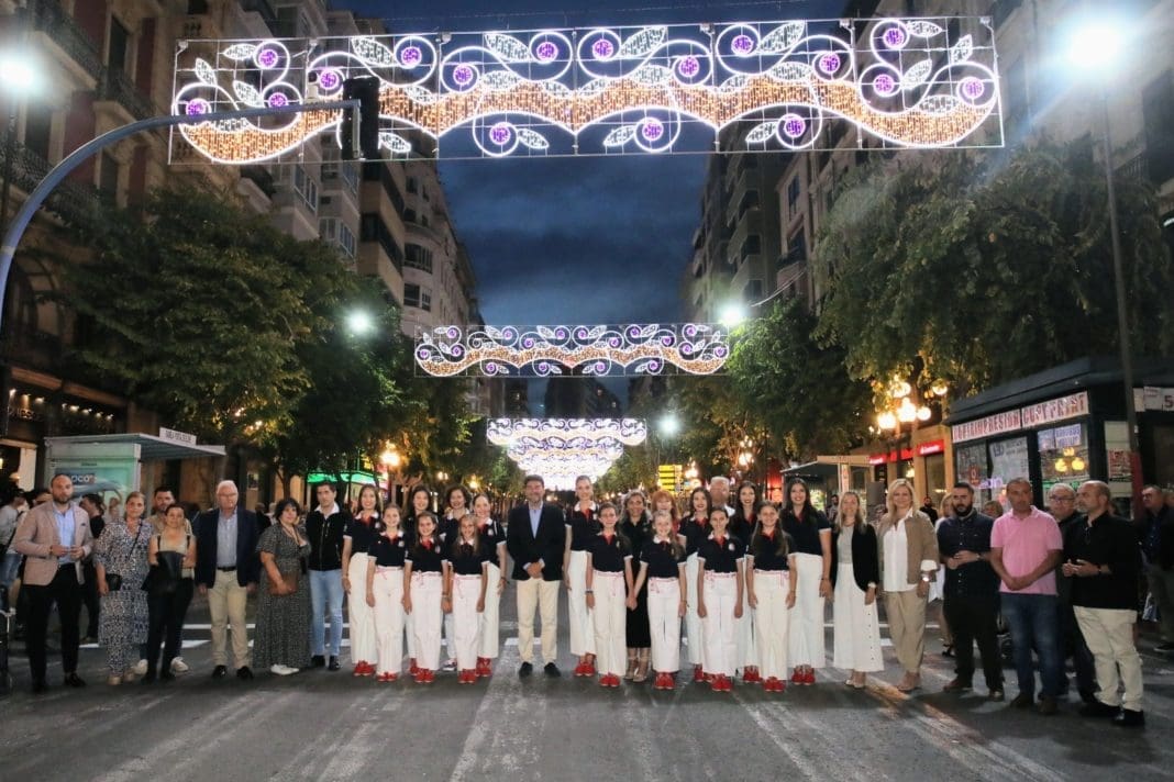 El alcalde Luis Barcala, junto con las Belleas del Foc -Belén Mora e Inés Llavador- y la vicealcaldesa y concejala de Fiestas, Mari Carmen Sánchez, ha encendido la iluminación después de accionar el dispositivo electrónico de la empresa Iluminaciones Ximénez, adjudicataria del contrato.