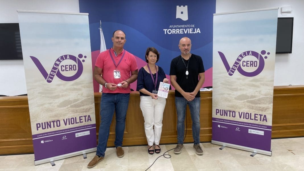 La concejal de Igualdad y Mujer del Ayuntamiento de Torrevieja, Inmaculada Montesinos, acompañada por el concejal de Bienestar Social, Óscar Urtasun, y el edil de Cultura, Antonio Quesada, han presentado en la mañana de hoy el Punto Violeta para la atención prioritaria en caso de violencia de carácter sexual o sexista o cualquier tipo de violencia contra las mujeres, que se instalará en todos los conciertos que se van a realizar en el Festival Brilla Torrevieja.