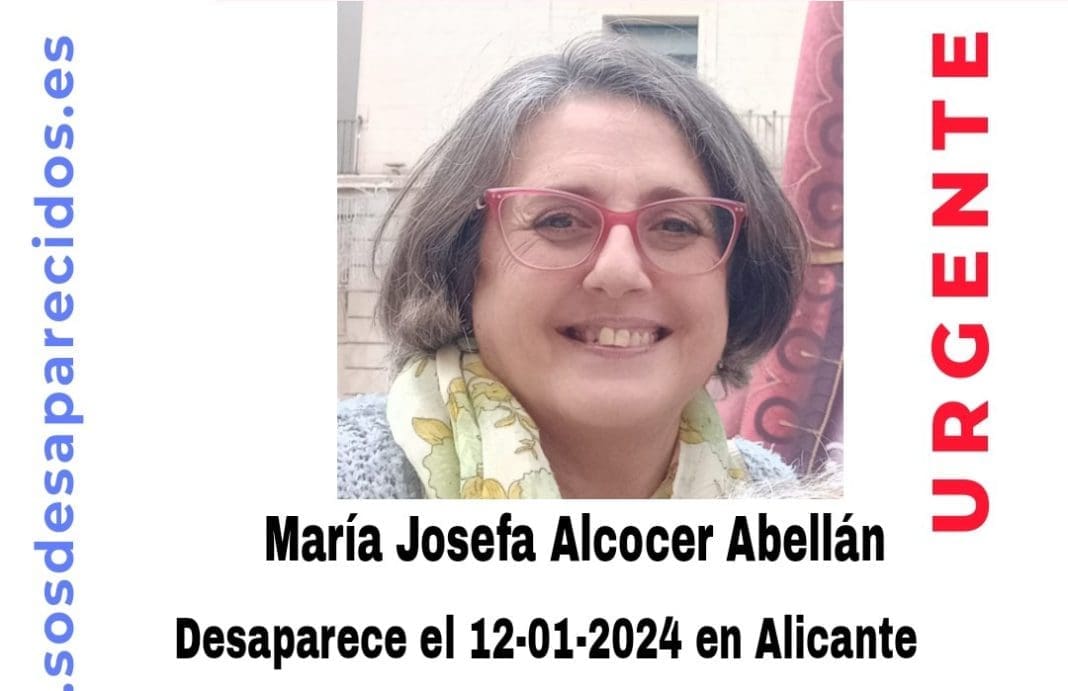 Desde la asociación SOS Desaparecidos alertan a través de redes sociales de la desaparición de una mujer en Alicante. María Josefa Alcocer Abellán, de 62 años, desapareció el pasado 12 de enero en la capital alicantina.