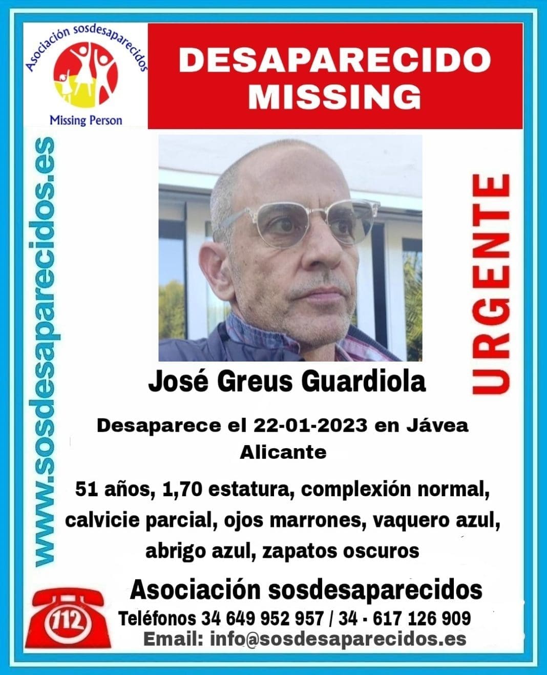 José Greus Guardiola, tiene 51 años, mide 1,70, es de complexión normal, tiene los ojos marrones, calvicie parcial y en el momento de la desaparición vestía un vaquero azul, un abrigo azul y unos zapatos de color oscuro.