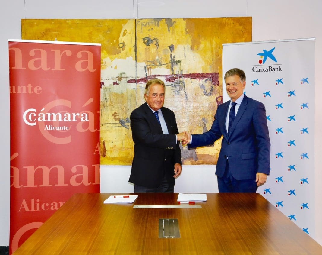 El presidente de la Cámara de Comercio de Alicante, Juan Riera, y el director territorial de CaixaBank en la Comunitat Valenciana, Xicu Costa, han firmado hoy un acuerdo de colaboración mediante el que la entidad financiera ofrece a las empresas miembros de la Cámara líneas de financiación, así como la organización de acciones conjuntas dirigidas a todas las empresas alicantinas.