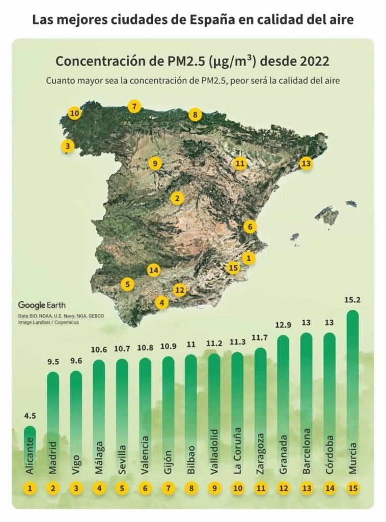 De España ha recordado que Alicante cuenta con la mejor calidad del aire de las 15 ciudades españolas analizadas con los datos de IQAir.com registrados desde 2022. Según la consultora, Alicante logra la clasificación más alta de España en cuanto a calidad del aire, registrando una concentración media anual de PM2.5 (μg/m³) de 4.5, que se encuentra dentro de las directrices de calidad del aire de 0-5 μg/m³ establecidas por la Organización Mundial de la Salud (OMS). En segundo lugar, se sitúa Madrid, con una concentración media anual de 9.5 µg/m³, seguida de cerca por Vigo con 9.6 µg/m³. Aunque ambas ciudades superan la media de calidad del aire recomendada por la OMS.