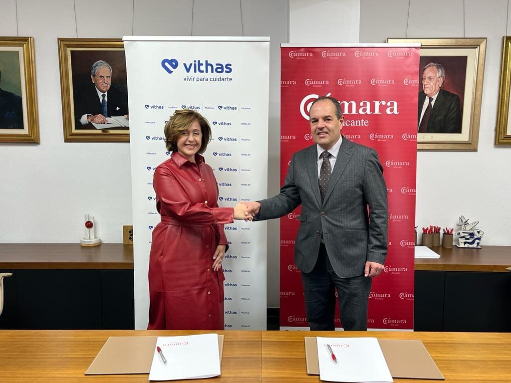 La directora territorial de Vithas en la Comunidad Valenciana, Victoria Verdú y el presidente de la Cámara de Comercio de Alicante, Carlos Baño, han firmado un acuerdo de colaboración entre ambas entidades en el que los Hospitales Vithas Alicante y Vithas Medimar quedarán suscritos a la institución empresarial alicantina como socios corporate.