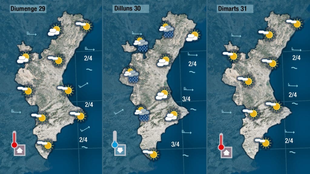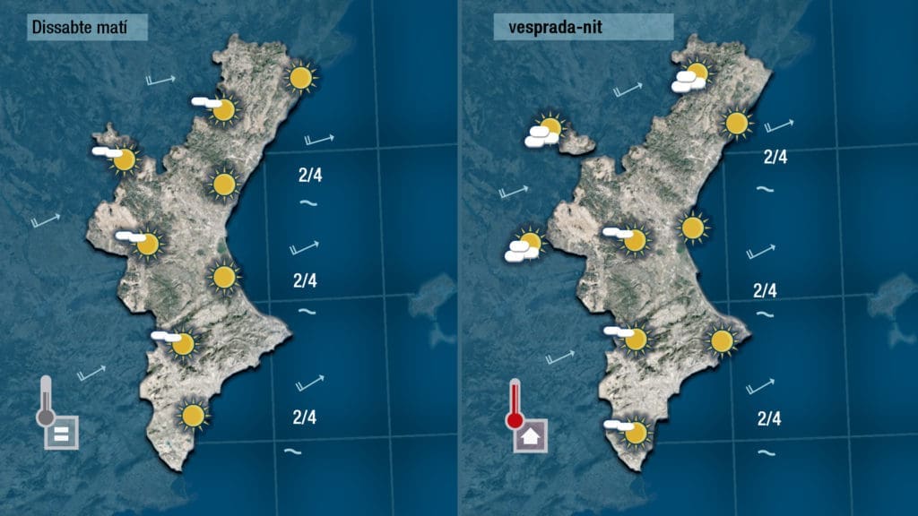 Mañana sábado daremos la bienvenida al fin de semana con ponientes y con temperaturas que sin subir mucho mostrarán tendencia ascendente. Al cielo predominará el sol, solo por el interior se verán nubes un poco más compactas de vez en cuando.