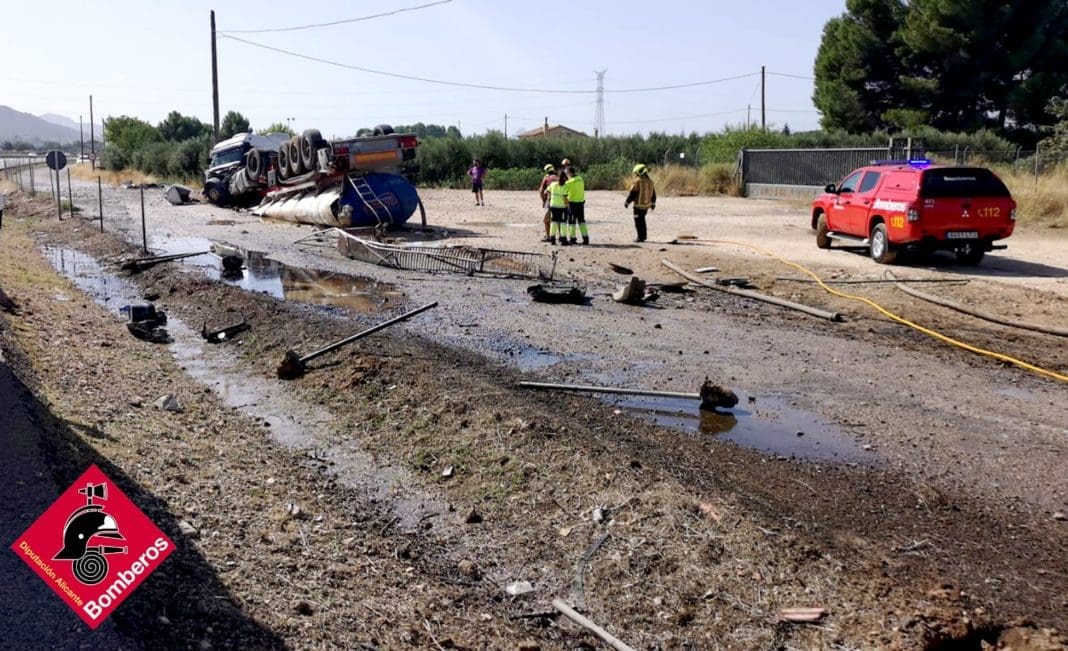El conductor ha resultado herido y el camión cisterna de grandes dimensiones ha quedado volcado. Transportaba salmuera y efectivos de bomberos están limpiando la vía.