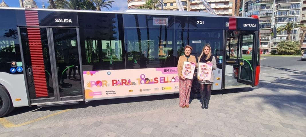 La campaña “Por ellas, para todas ellas” que ha puesto en marcha la Concejalía de Igualdad con motivo de la celebración el próximo 8 de marzo del Día Internacional de la Mujer circula desde este miércoles en los autobuses de línea gracias a la colaboración de Vectalia. Al mismo tiempo Igualdad colabora en otra campaña de sensibilización que también arranca este miércoles y que se podrá ver en las paradas del TRAM con el lema “¿Piensas lo que dices?” elaborada por la Escuela Superior de Arte y Diseño de Alicante (EASDA).