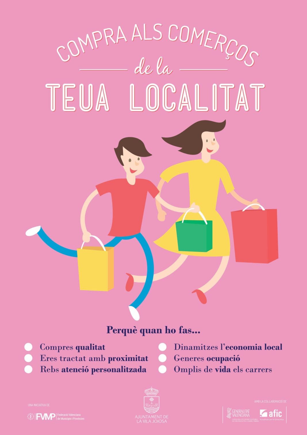 Las calles y comercios de la Vila Joiosa se están llenando de carteles que rezan ‘compra als comerços de la teua localitat’. Este cartel ha sido impulsado por la Federación Valenciana de Municipios y Provincias.