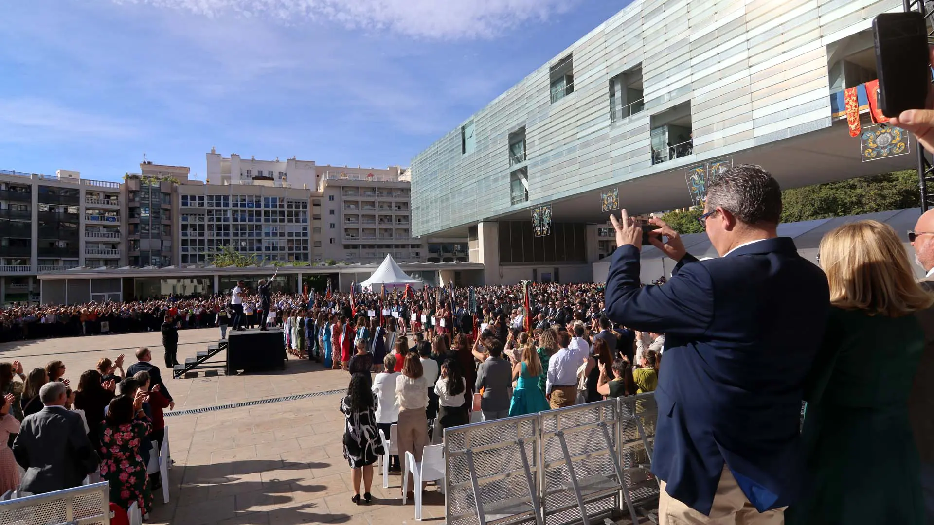 Todas ellas han interpretado distintos pasodobles festeros en su entrada a la plaza y han recibido en sus banderas y estandartes un corbatín de manos de las reinas de 2023, en conmemoración a su participación en este acto. Seguidamente, y cuando ya estaba todo listo, ha llegado el momento más esperado tanto por los propios músico como por los festeros, las autoridades y los varios centenares de personas congregadas en la plaza: la Interpretación del pasodoble ‘Fiesta en Benidorm’, dirigidos por el compositor de la obra, el maestro Rafael Doménech Pardo, al que el público ha acompañado con bailes, palmas y una gran ovación final tras sonar los últimos acordes.