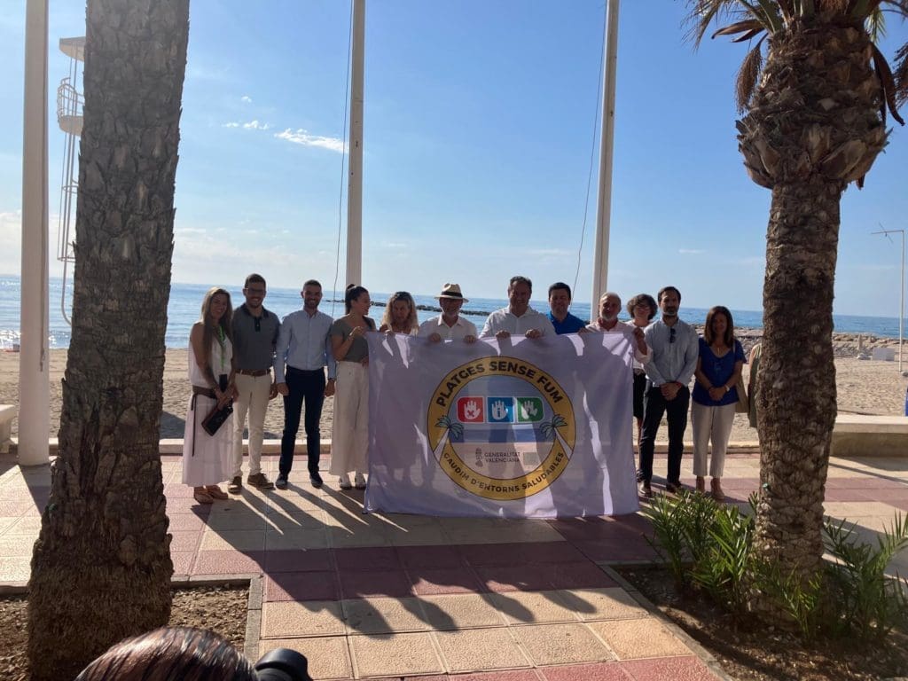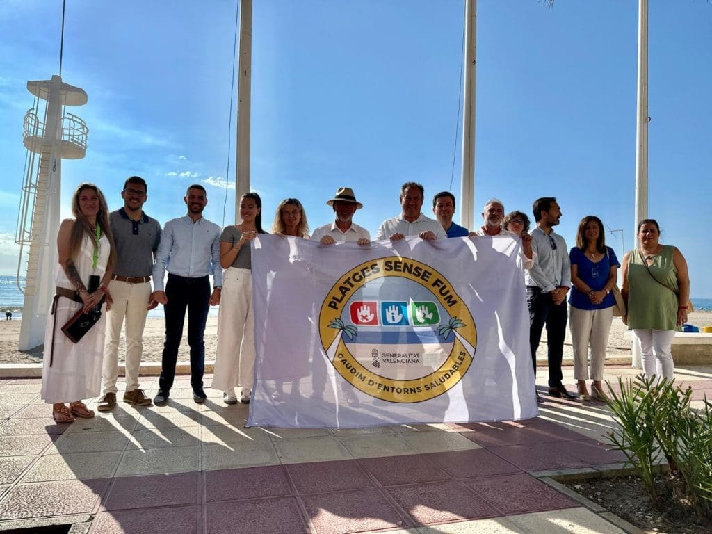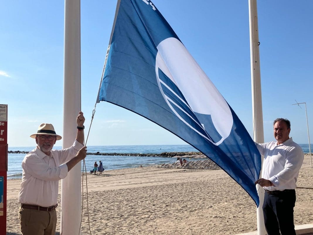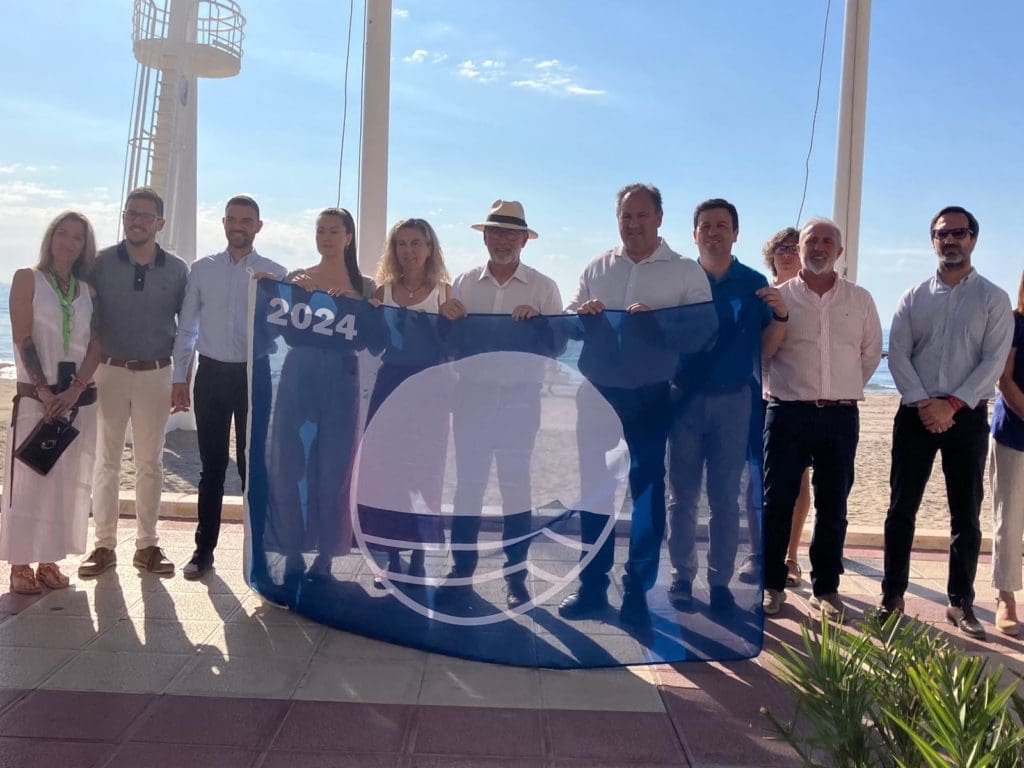 En el acto de izado de las enseñas han participado el alcalde, Juanjo Berenguer; el concejal de Playas, Rafa Galvañ, y representantes de los grupos municipales PP, PSPV-PSOE y Vox.