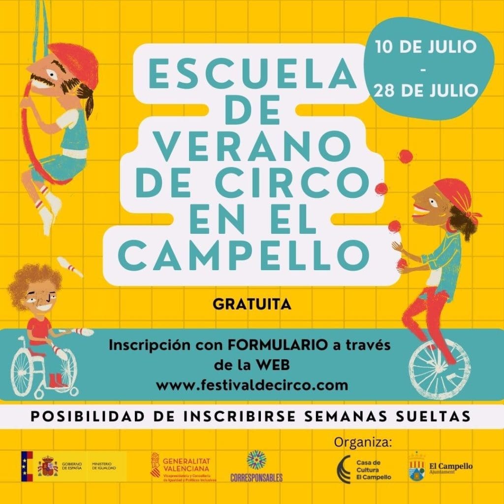 La Escuela de Verano de Circo para niños llega a El Campello del 10 al 28 julio en la Casa de la Cultura. La duración es de tres semanas completas, de lunes a viernes con horario de 9:00 a 13:00 horas, con posibilidad de apuntarse semanas sueltas.