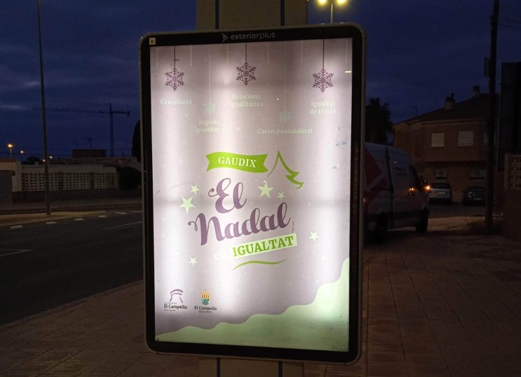 Ahora, en su segunda edición, “Disfruta la Navidad en Igualdad”, da un paso más y estará presente, además de en la web y redes sociales municipales, en decenas de mupis de nuestro municipio, donde se lanzarán mensajes igualitarios en los que los que el foco estará puesto en los obsequios igualitarios y la educación en la corresponsabilidad, conciliación e igualdad de trato.