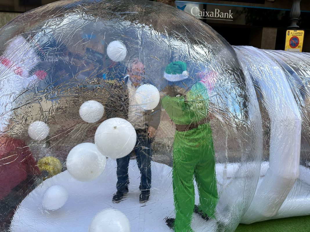 Una gran bola de Navidad transparente, instalada sobre una plataforma móvil y transportada por un vehículo, recorre distintos puntos de la localidad. Las personas que realicen compras superiores a 10 euros en los comercios de El Campello pueden participar y optar a un regalo. Esto fomenta el consumo en los establecimientos locales. Únicamente tienen que superar la divertida prueba de entrar en la bola, “cazar” uno de los globos de su interior y descubrir qué regalo le ha tocado.