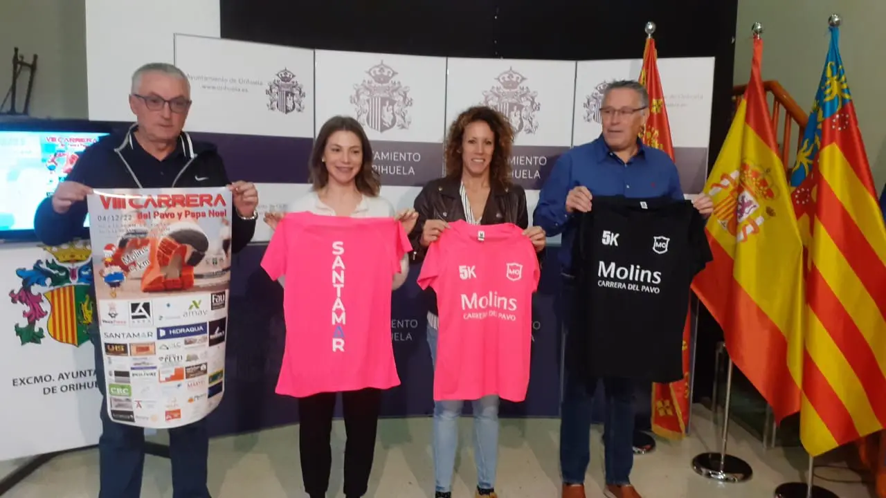 La pedanía de Molins acogerá, el próximo domingo 4 de diciembre, la VIII Carrera del Pavo y Papá Noel. Así lo han anunciado hoy la concejala de Deportes, Patricia Menárguez; el tesorero del club Tragamillas, Francisco Belmonte; el presidente de la asociación Amigos de la Cultura y del Mundo Rural de Molins, Rafael Barrios y la alcaldesa pedánea de Molins, Aynara Navarro.