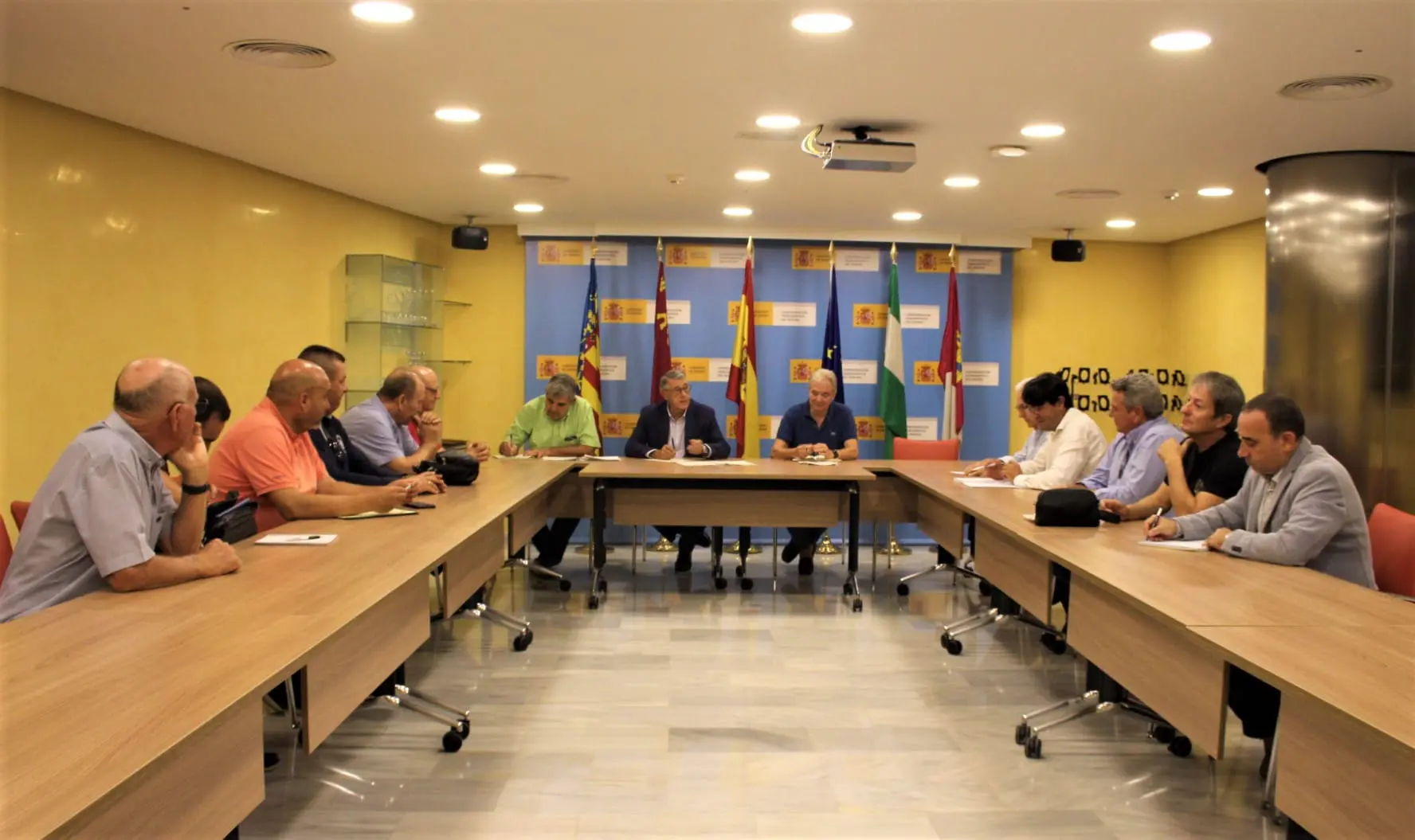 El presidente de la Confederación Hidrográfica del Segura (CHS), Mario Urrea, junto al Comisario de Aguas, Francisco Javier García, y el Director Técnico, Carlos Marco, han mantenido una reunión de trabajo con los representantes de las Comunidades de Regantes (CCRR) de la zona de La Pedrera (Alicante), acompañados por José Vicente Andreu (ASAJA).