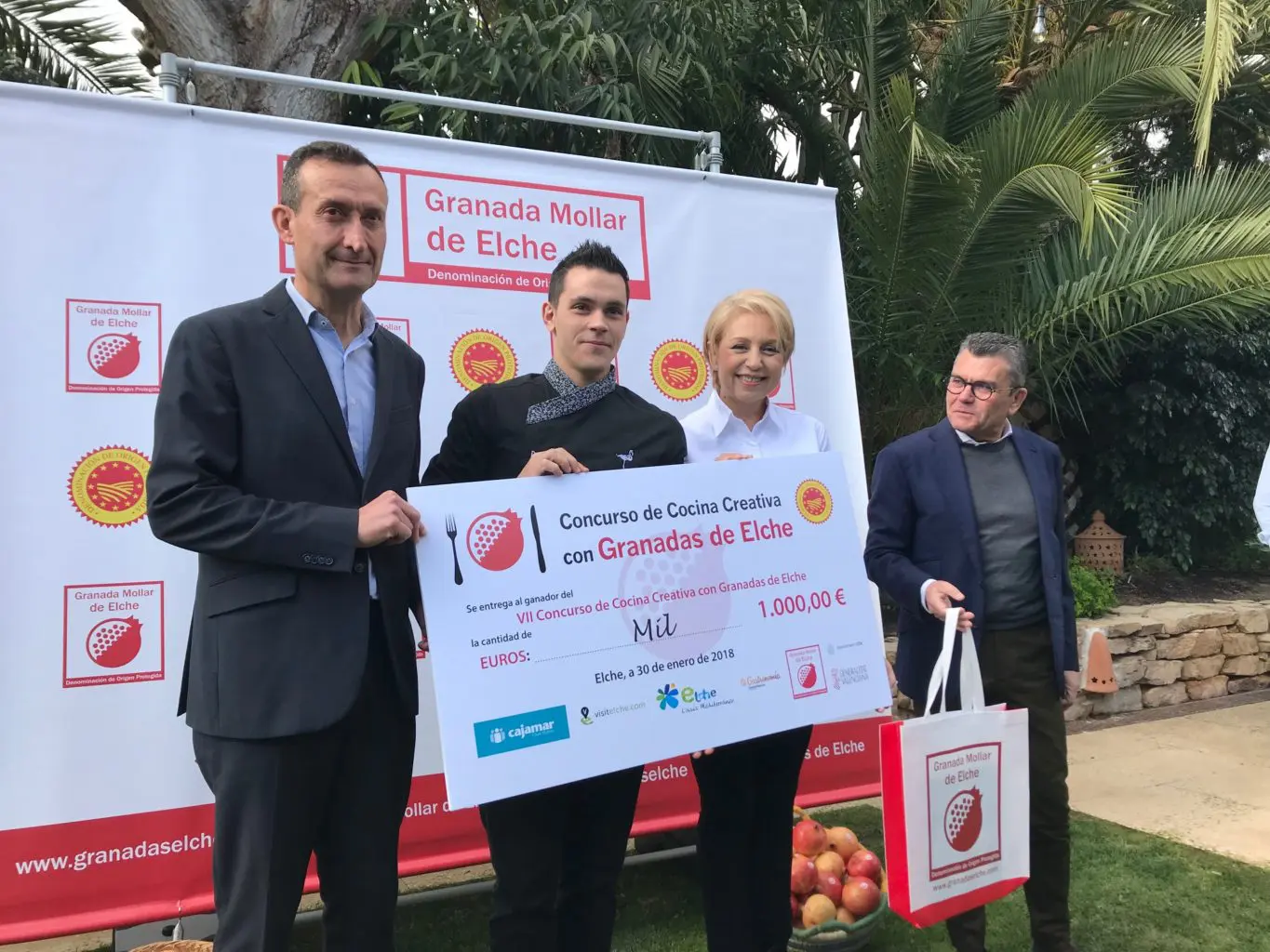 El primer premio, dotado con mil euros, se lo llevó David Morilla, jefe de cocina del restaurante Monshao, del hotel Doña Monse Spa&Golf, de Torrevieja, que ha presentado un postre denominado “Mochi, kimchi, petit suisse & caramelo de granada mollar”. El alcalde de Elche, Carlos González, el presidente de la Asociación de Productores y Comercializadores de Granada Mollar, Francisco Oliva, y la presidenta del jurado, Susi Díaz, fueron los encargados de entregar el galardón.