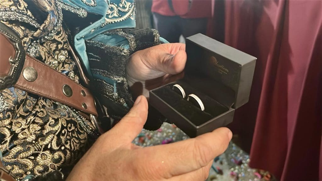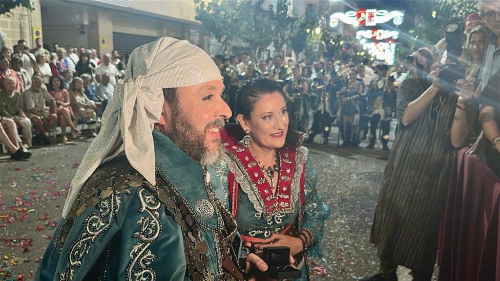 Ella, Alejandra Villaplana i Brotons, en su principal papel de capitana cristiana, saludaba a diestro y siniestro mientras desfilaba la comitiva festera ante la tribuna con las autoridades e invitados puestos en pie cuando, de repente, la banda de música paró en seco y dejaron de sonar los instrumentos. Su marido y capitán, Antonio, se adelantó un poco, se dio media vuelta, hincó rodilla en tierra ante ella, abrió la cajita con los consabidos anillos y le pidió volver a casarse, allí mismo y en ese momento.