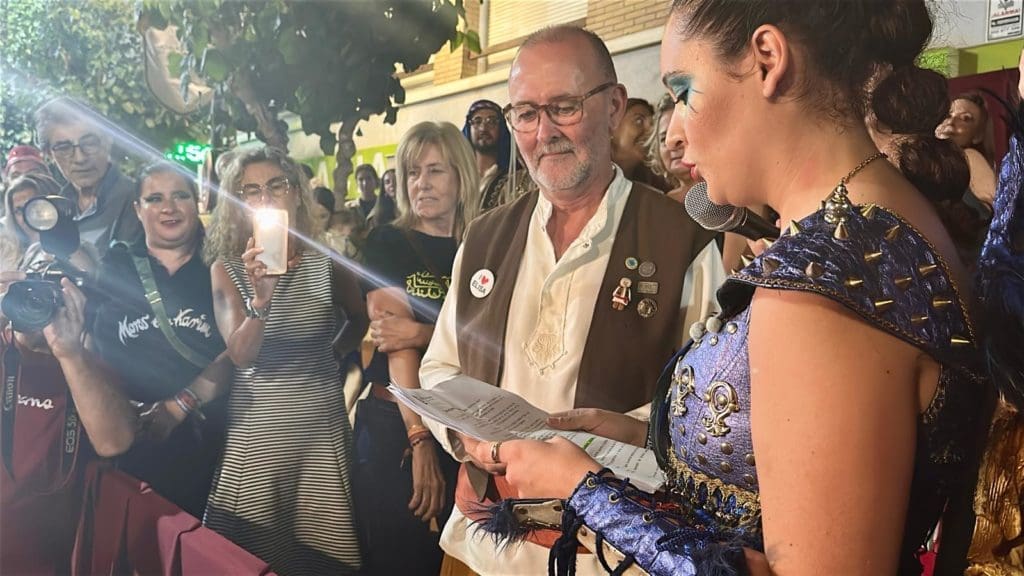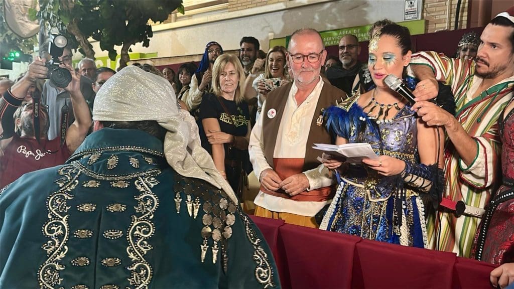 Hace semanas, el capitán cristiano, Antonio R. Moñinos Baeza, le planteó al alcalde, Juanjo Berenguer, la posibilidad de celebrar la renovación de los votos matrimoniales con su esposa de esa forma tan original. El primer edil, que actúa de fedatario oficial y maestro de ceremonias en numerosas ocasiones a lo largo del año, no lo dudó ni un instante. El Ayuntamiento preparó el expediente, dispuso megafonía portátil y desplazó hasta la tribuna el Código Civil.