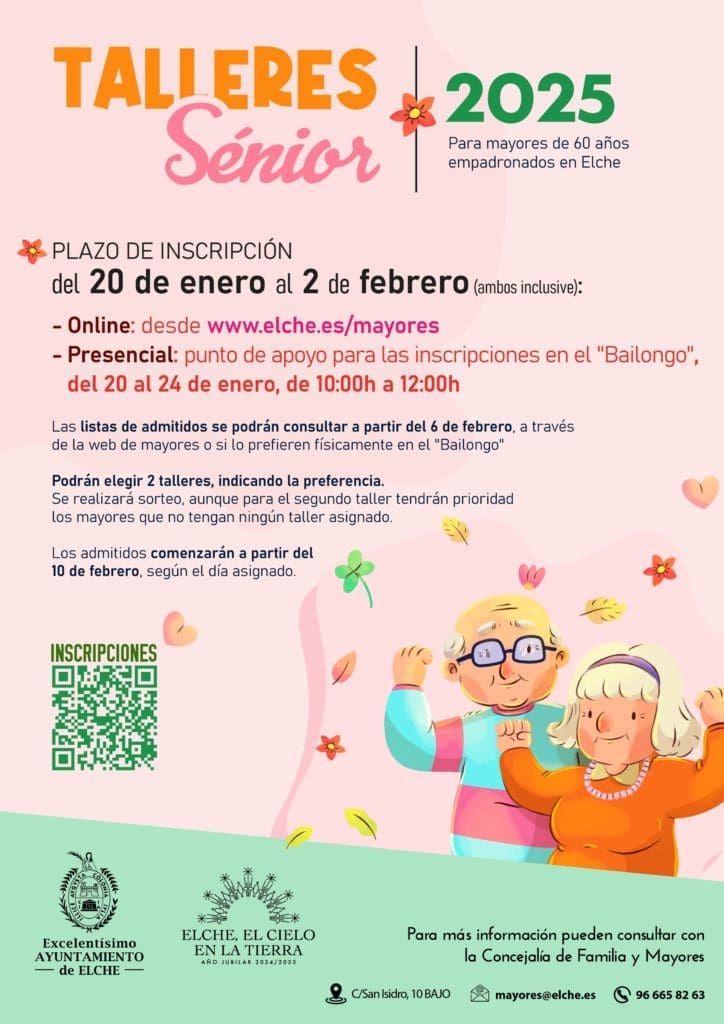 Los cursos comenzarán el 10 de febrero y todos aquellos mayores que deseen participar tendrán que inscribirse a partir del lunes, 20 de enero hasta el 2 de febrero de 2025. La inscripción podrán hacerla rellenando un formulario a través de la página web www.elche.es/mayores o de forma presencial en el Centro Cívico del Candalix en horario de 10:00 a 12:00 horas desde el 20 hasta el 24 de enero.
