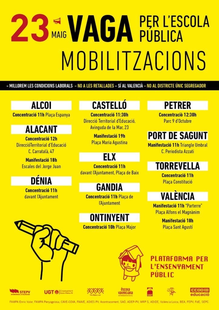 En cuanto al día 23, habrá una concentración matinal a las 9.30 horas en el IES Cap de l’Horta y otra a las al mediodía delante de la Dirección Territorial de Educación de Alicante; así como en Dénia, Elche y Petrer, con la intención de sumar el alumnado, las familias y los docentes a la jornada de huelga que, en Alicante, acabará con la manifestación a las 18 horas en las escaleras de Jorge Juan.