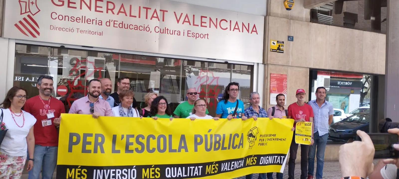 La Plataforma en Defensa de l’Ensenyament Públic ha convocado esta mañana una concentración delante de la Dirección Territorial de Educación de Alicante para informar sobre los actos previos a la huelga del 23 de mayo contra la «ley de libertad educativa», y en defensa del valenciano y de las mejoras en las condiciones laborales.