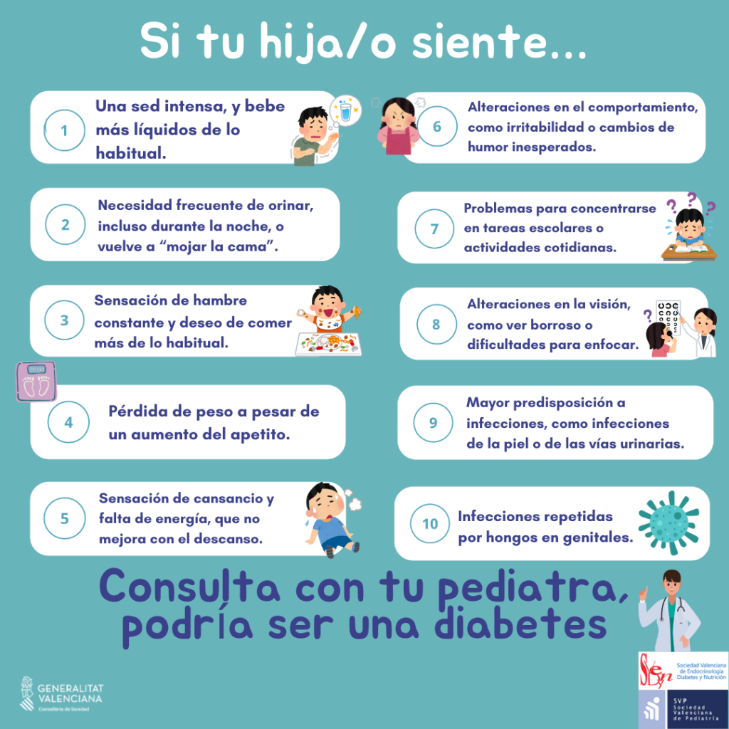 La directora general de Atención Primaria, Eva Suárez, subraya que “es importante que los padres y madres puedan detectar posibles síntomas asociados a la diabetes para que, en caso de sospecha, consulten cuanto antes a los pediatras”. El decálogo recoge señales como sed intensa, micciones frecuentes, hambre persistente, pérdida de peso, cansancio continuo o cambios de humor inesperados.