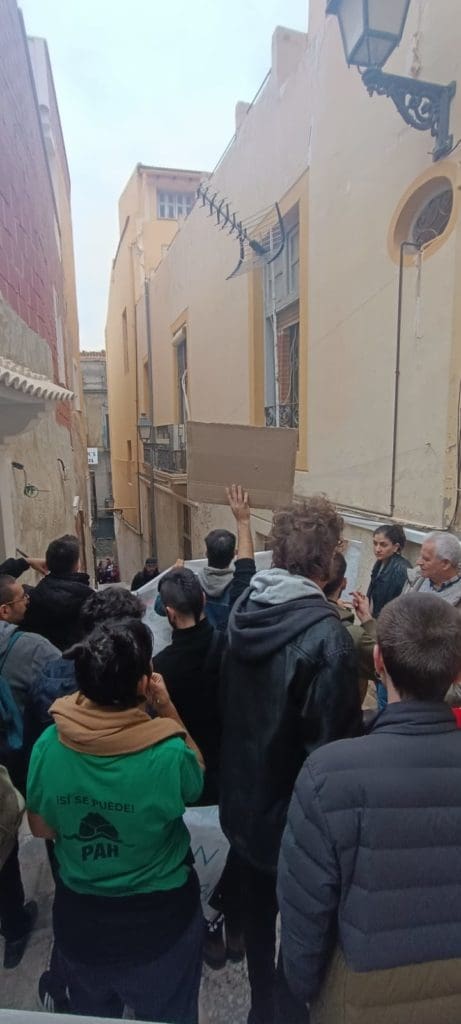 Según testigos presenciales, el desahucio ha concentrado a más de medio centenar de personas en esta calle transversa a la calle Villavieja del casco histórico de la ciudad. La persona desalojada es Alí, un ciudadano iraquí de 73 años que lleva varias décadas en Alicante, indican desde el Sindicat de Barri Carolines. Según señalan dejó de pagar su alquiler en el mes de noviembre y es una persona «sin alternativa habitacional». El hombre ha sido trasladado a un centro sanitario durante el lanzamiento al sentirse indispuesto.