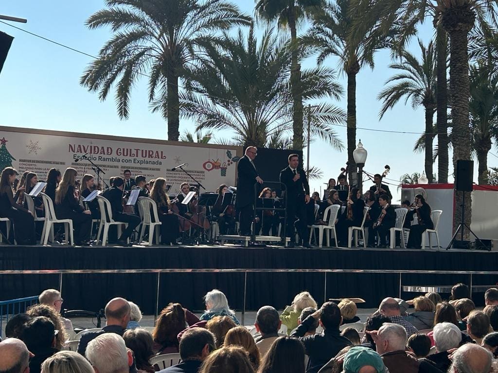 La nueva zona peatonal situada entre la Explanada y la Rambla ha acogido este sábado el Concierto Extraordinario de Navidad de la Orquesta de Jóvenes de la Provincia de Alicante, un evento cultural que ha congregado a un gran número de alicantinos y que ha contado con la asistencia de los concejales de Cultura, Juventud, Mayores y Familia, Nayma Beldjilali y de Movilidad Urbana, Vivienda y Partidas Rurales, Carlos de Juan. Los músicos de la Orquesta de Jóvenes de la Provincia de Alicante han interpretado diversos temas navideños ante cientos de alicantinos congregados, que han disfrutado de su virtuosismo y del fantástico ambiente en esta zona recientemente habilitada para los peatones.
