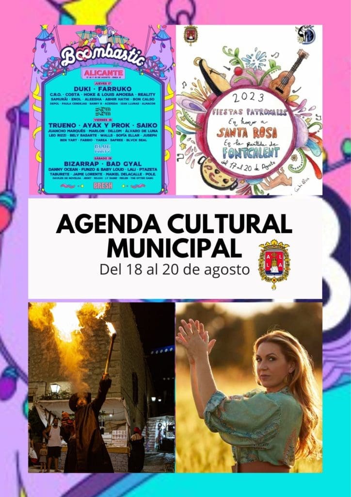 Alicante inicia este fin de semana con una variada programación cultural. El Espacio Rabasa alberga este jueves el festival Boombastic Por otra parte, la partida de Fontcalent y el barrio de San Agustín celebran sus fiestas patronales con pregones y nombramientos de Reinas y Cargos de honor. Además, la Plaza de Toros de Alicante acoge este domingo el concierto de la artista gaditana, Niña Pastori en el que presenta su gira ‘Camino 2023’.