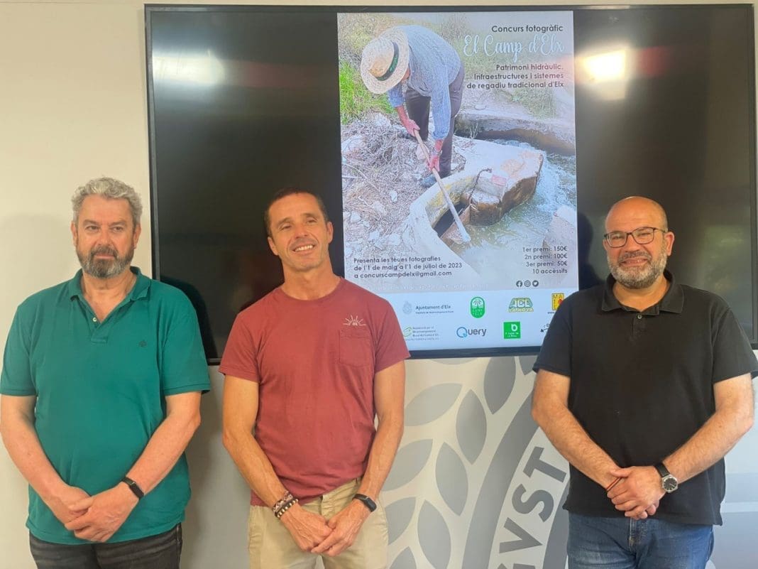 El edil del área, Felip Sànchez, el presidente de BaiaJovens, Vicent Soler, y el presidente de ADR, José Luis Miralles, han presentado este certamen que este año se centra en el sistema de regadío agrícola tradicional, que ha condicionado el cultivo de la palmera y otras plantaciones, así como el crecimiento económico, social, y agrario del municipio.