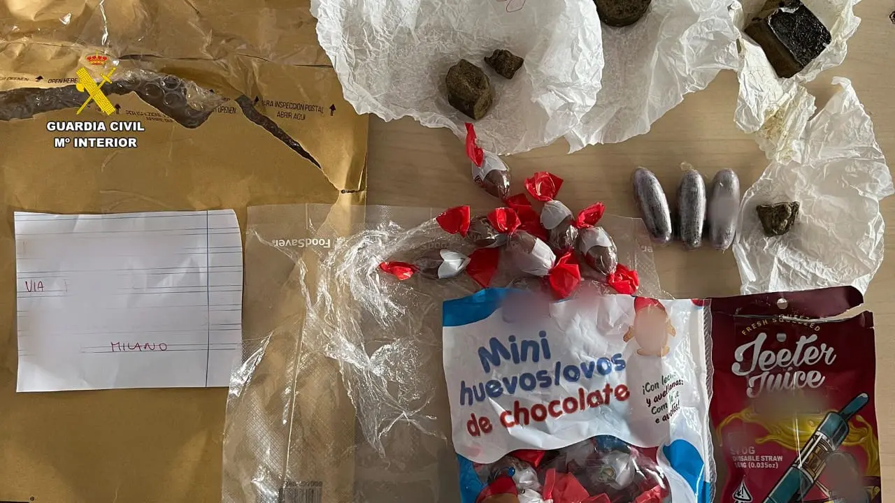 Al realizar un examen exhaustivo de los paquetes, se localizaron en su interior, tres tabletas de hachís, dos trozos más pequeños de la misma sustancia y una bolsa que contenía chocolatinas en forma de huevo.