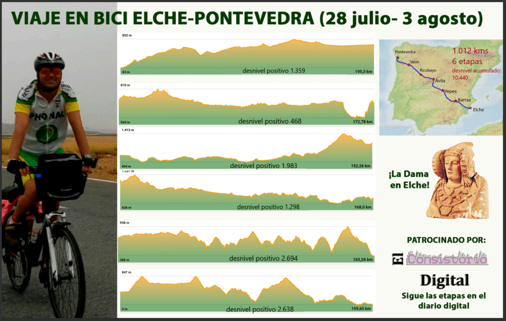 El presidente de la formación política municipalista ilicitana, Contigo Elche, Carlos San José, tiene previsto cruzar España en bicicleta para unir dos grandes objetivos, por un lado, el personal como un gran reto deportivo y por otro aprovechar el viaje para visibilizar una vieja reivindicación local «con el anhelado» regreso de la Dama de Elche. Se irán recogiendo firmas y realizando fotos con la Dama de Elche en los distintos pueblos por donde vaya transitando.