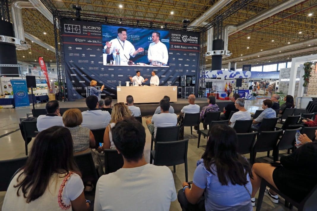 La primera sesión estuvo protagonizada por el tándem formado por Steven Wu, de Sen Omakase (Madrid) y José Manuel Miguel de Beat de The Cookbook Hotel (Calpe), que acumula una Estrella Michelin y dos Soles Repsol. El cocinero, de origen asiático, ha explicado que ha elaborado un Hassun, un plato de que representa la temporada en la cocina japonesa. “Siguiendo esas cinco técnicas, cinco colores, cinco sabores y cinco sentidos con lo que intentamos hacer un plato que represente la estacionalidad”. Wu ha comentado que ha sido la primera vez que ha participado en Alicante Gastronómica y “espero que no se la última”.