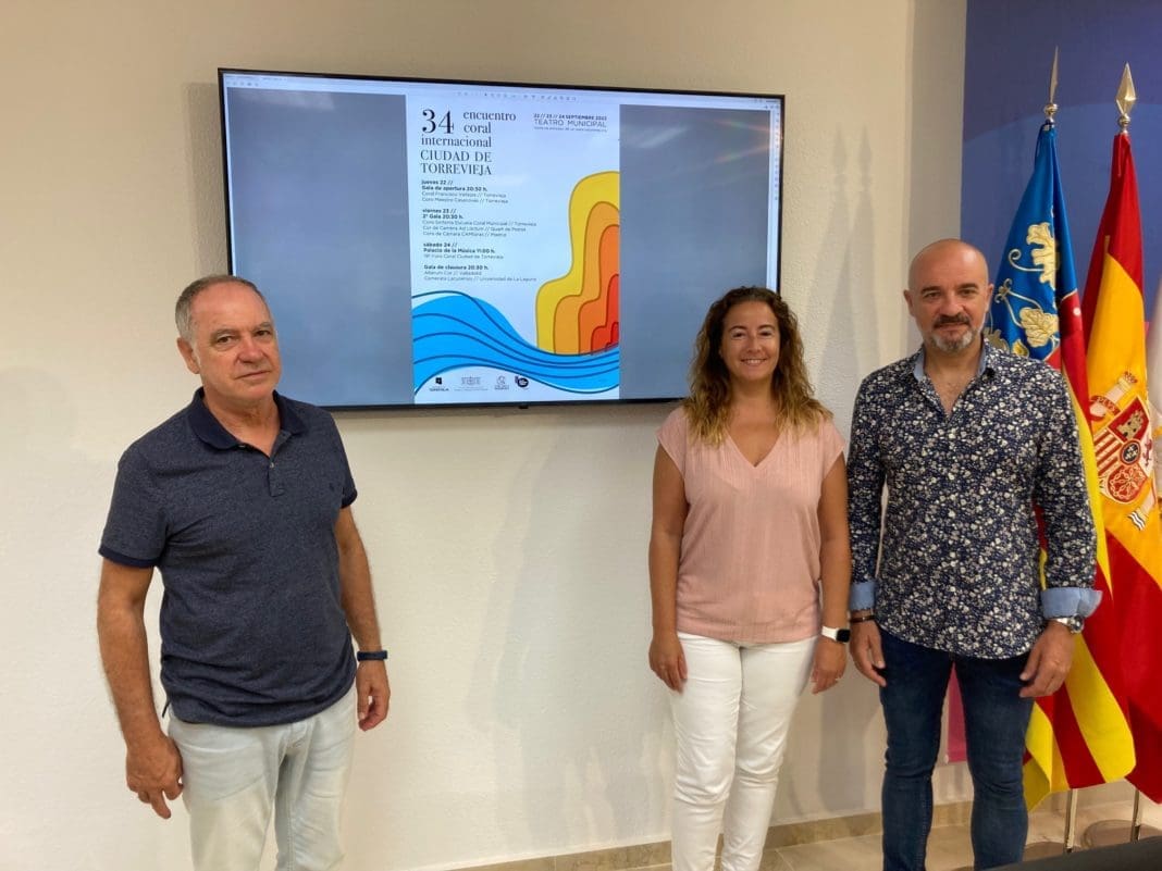 El concejal de Cultura, Antonio Quesada, junto con la directora de la Coral Francisco Vallejos (organizadora del evento junto con el Patronato Municipal de Habaneras), Belén Puente, y el presidente de la Coral, José Miguel Ferrández, han presentado en la mañana de hoy el 34º Encuentro Coral Internacional “Ciudad de Torrevieja”, que volverá a celebrarse dos años después debido a la pandemia provocada por la COVID-19.
