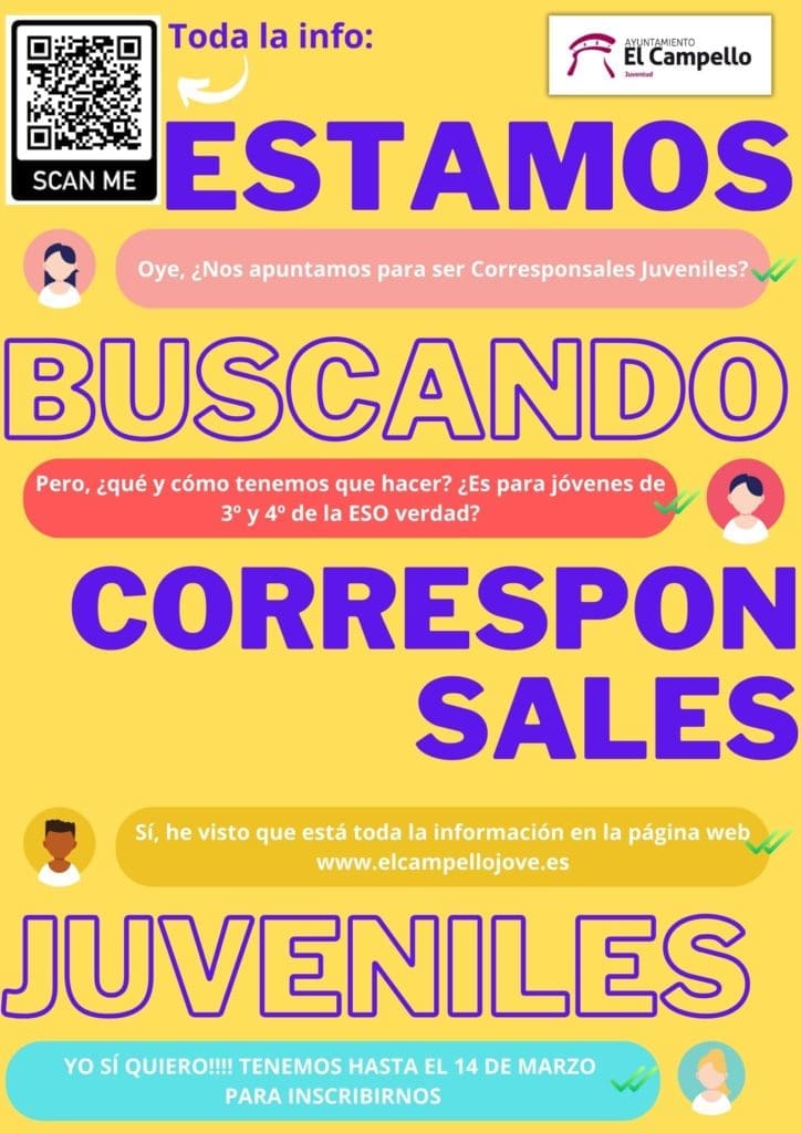 La primera de ellas, “Corresponsales juveniles”, se plantea pensando espacialmente en estudiantes de 3º y 4º curso de la ESO del municipio que quieran ser el enlace entre sus compañeros de instituto y el Ayuntamiento, difundiendo información sobre actividades y recogiendo propuestas sobre los temas más diversos de su interés.