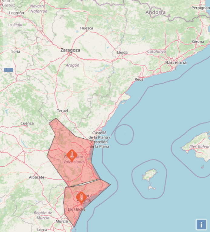 En la Comunitat, los días calor intenso serán los del fin de semana. El litoral norte de Alicante se encuentra en alerta naranja este sábado por altas temperaturas, con máximas de hasta 39 grados, que serán, además, persistentes. Mientras, el litoral sur de la provincia está en nivel amarillo, pudiendo alcanzar los 36 de máxima y con mínimas también elevadas.