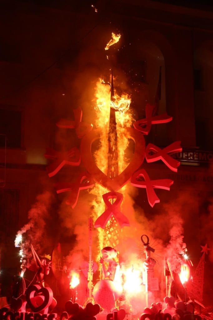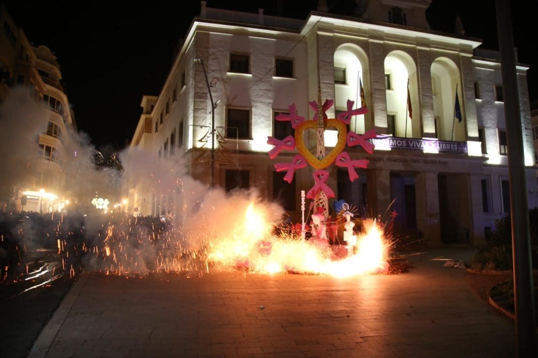 Antes de que Cristina Camarero, foguerera de San Nicolás de Bari-Benisaudet, encendiera la traca con la que ardió el monumento, fueron las Belleas del Foc adulta e infantil -Belén Mora e Inés Llavador- y sus Damas de Honor quienes soltaron unos globos, en forma de corazones, como homenajes a los foguerers fallecidos a consecuencia del cáncer.