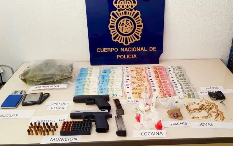 En las viviendas los agentes se incautaron de casi 5.000 euros en efectivo, 11.400 gramos de marihuana distribuidos en cogollos, varias dosis de cocaína y hachís, prismáticos de vigilancia, básculas de precisión y una pistola 9 milímetros parabellum con 50 cartuchos.