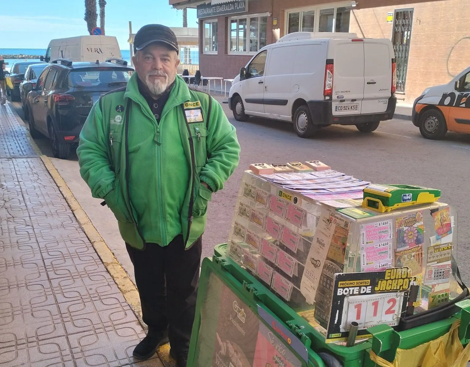 El vendedor de la ONCE Ángel José Santos López es quien llevó la suerte a Torrevieja con estos 1.680.000 euros del Cupón Fin de Semana del domingo, 23 de marzo, con diez cupones entre ellos el Sueldazo del Fin de Semana, que ha repartido entre sus clientes habituales desde su punto de venta en la Calle Fragata.  Ángel José es vendedor de la ONCE desde agosto de 2017, adscrito a la Agencia de la ONCE en Orihuela.