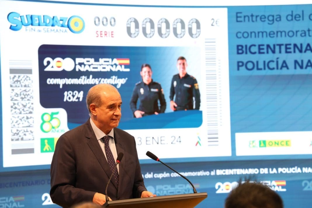 Un total de cinco millones y medio de cupones para el sorteo del “Sueldazo del Fin de Semana”, que tendrá lugar el próximo día 13, conmemorarán esta efeméride por toda España. El cupón, que ha sido presentado esta mañana en un acto que ha contado con la presencia del director general de la Policía, Francisco Pardo Piqueras, y el vicepresidente del Grupo Social ONCE, Alberto Durán López, incluye el lema “Comprometidos contigo”, y la referencia al periodo 1824-2024 en conmemoración al 200 aniversario.