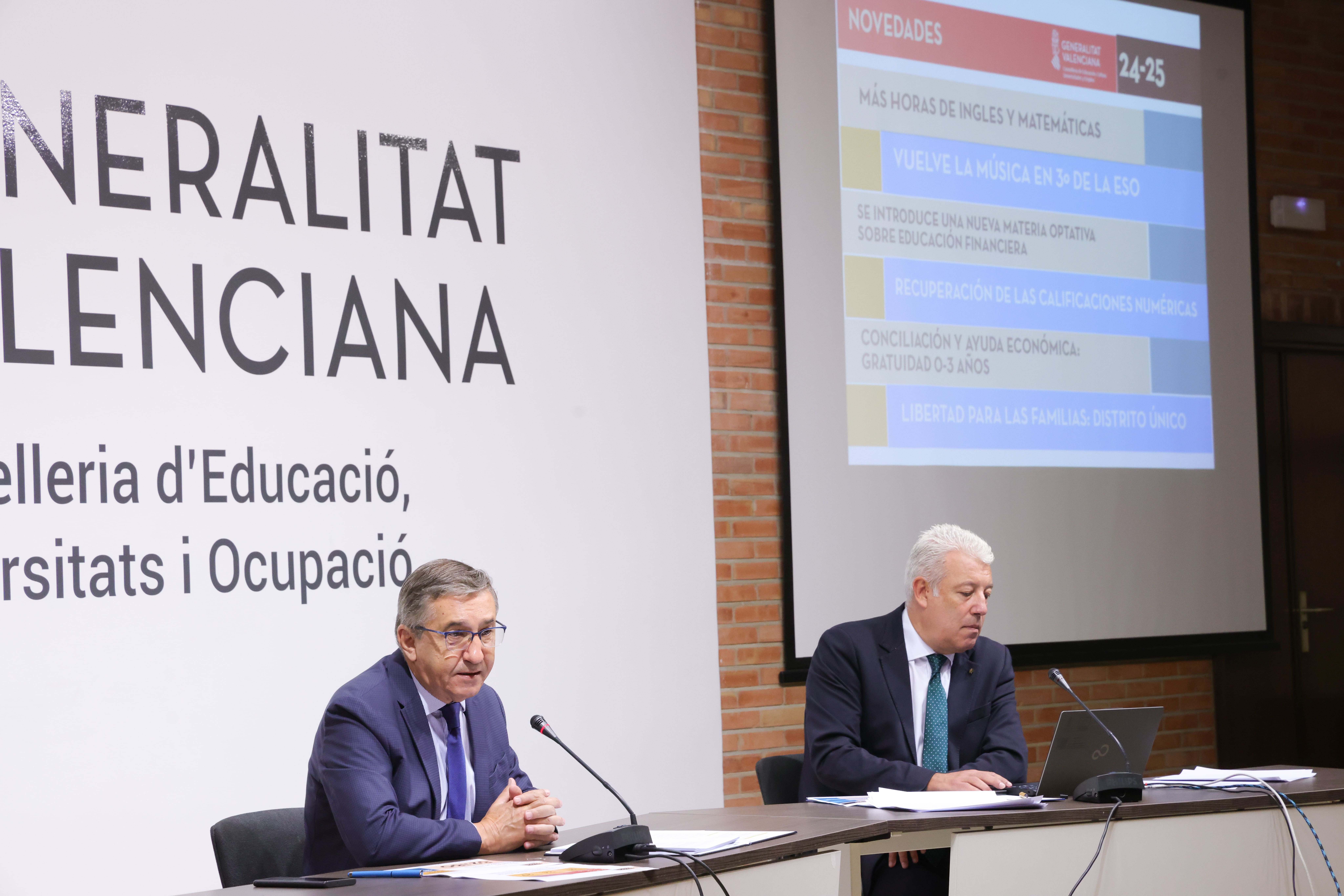 El conseller de Educación ha presentado este jueves en rueda de prensa, junto al secretario autonómico de Educación, Daniel McEvoy, los datos de este curso escolar que comienza el próximo 9 de septiembre en la Comunitat Valenciana en las etapas de Infantil, Primaria, Secundaria, Bachillerato y Formación Profesional con un aumento de alumnado y profesorado.