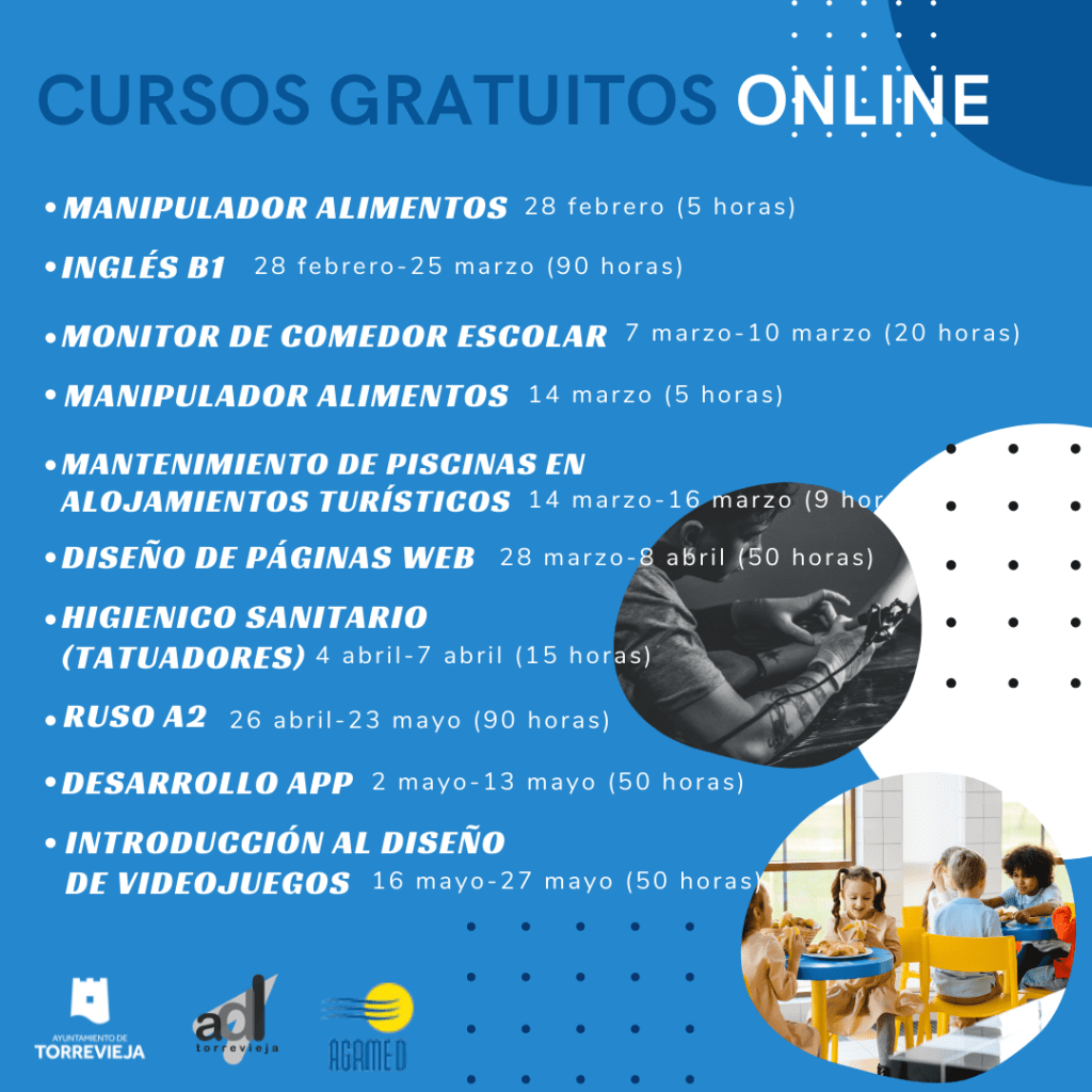 El concejal de Empleo y Fomento, Domingo Paredes, informa que el Ayuntamiento de Torrevieja, a través de la Agencia de Desarrollo Local (ADL) y gracias al convenio firmado con AGAMED, impartirá diez cursos gratuitos online, que se desarrollarán entre los meses de febrero y mayo de 2022.